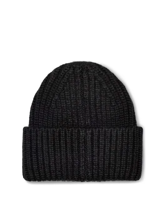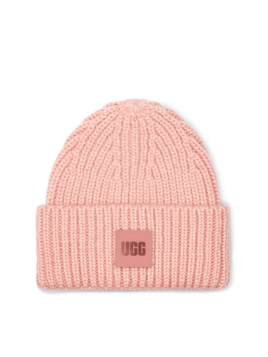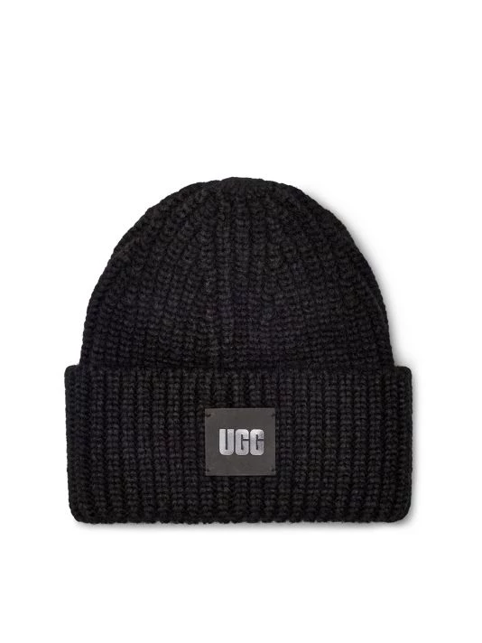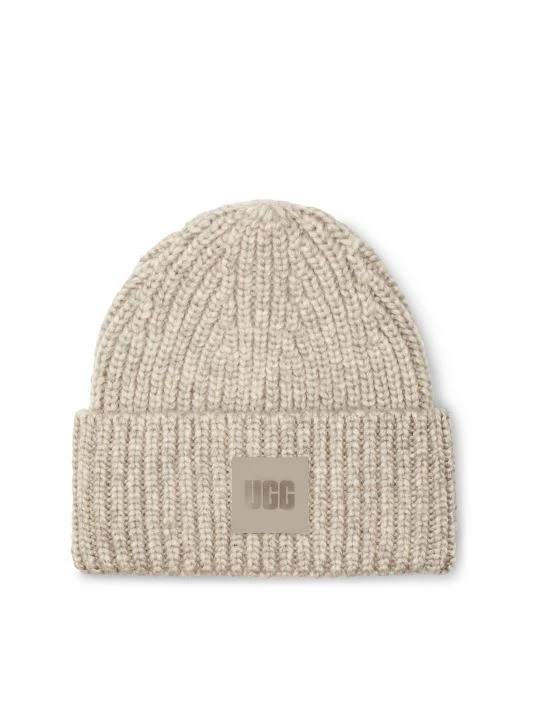 Chunky rib knit beanie with a logo patch at the brim.