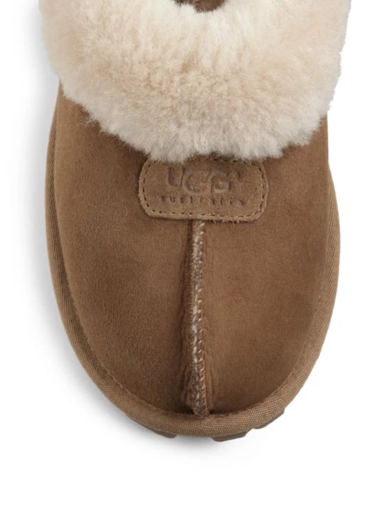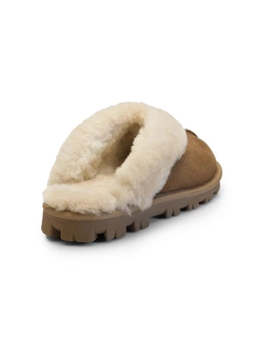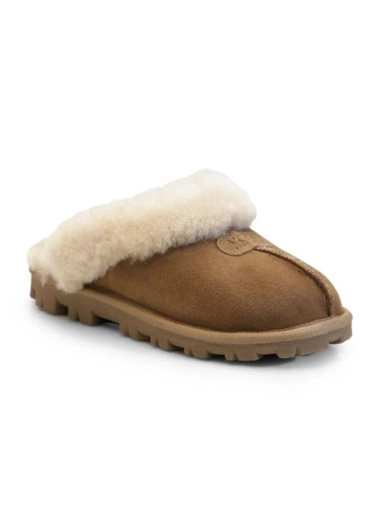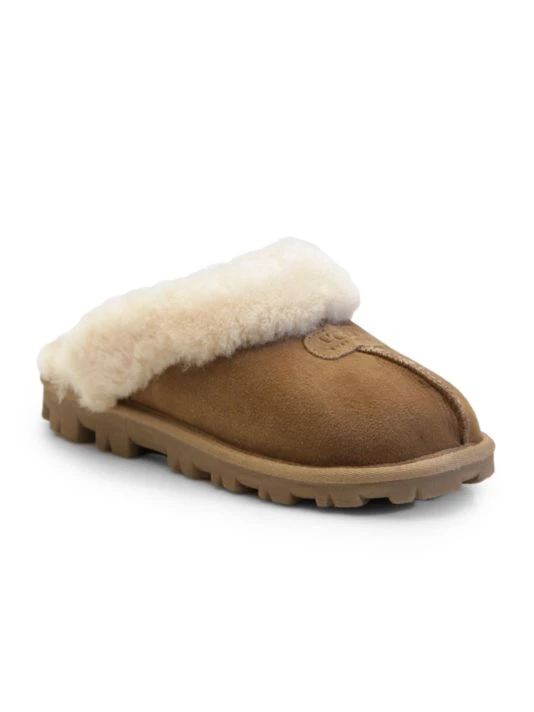 Soft and cozy clog-style slippers featuring plush sheepskin.