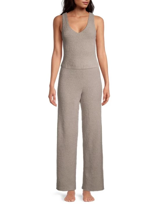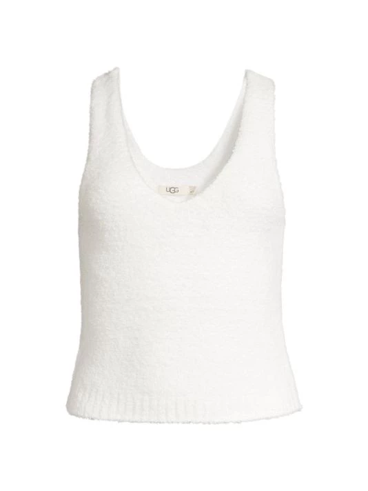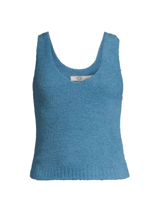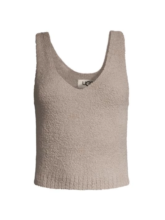 From the Cozy Knit Collection. Deep V-neck tank top made of fuzzy knit fabric with a ribbed hem.