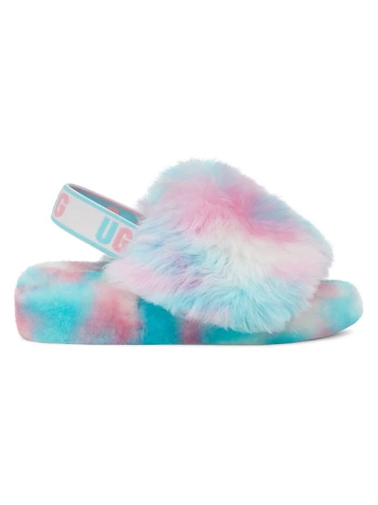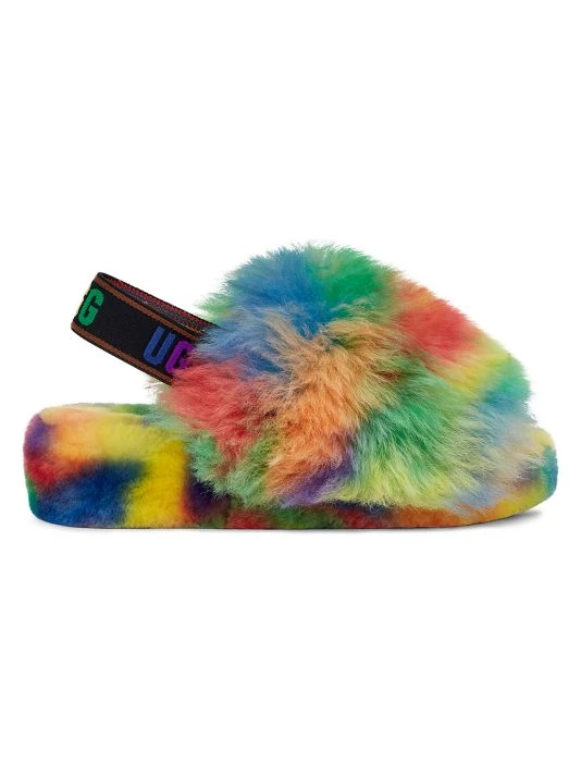 Anchored by a lightweight platform, the Fluff Yeah Pride sandals by UGG are crafted of plush multicolored faux shearling. This standout pair is fastened with a logo-embroidered elasticized strap.