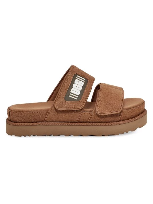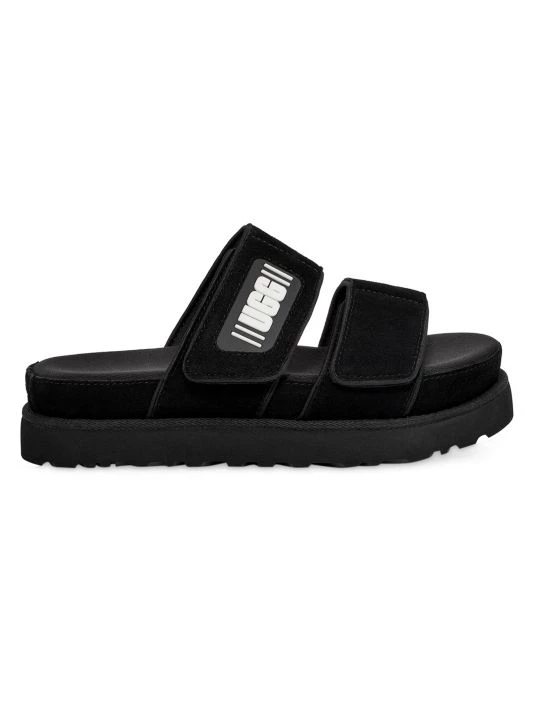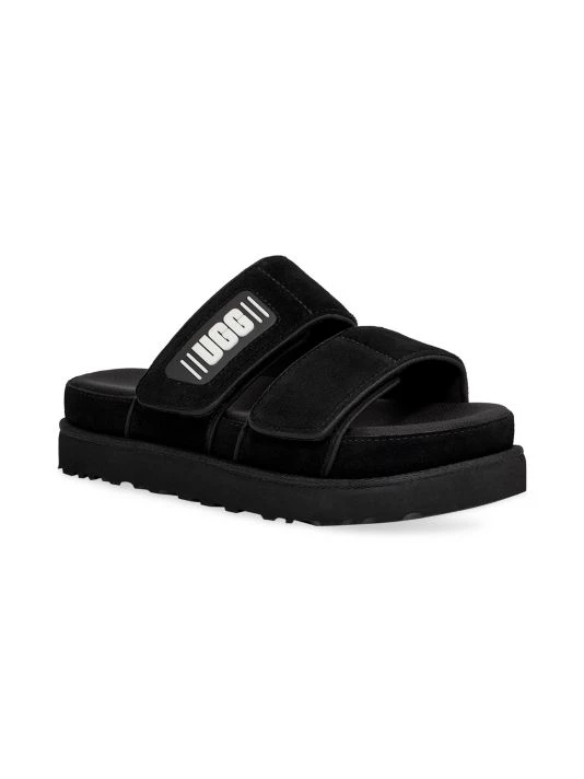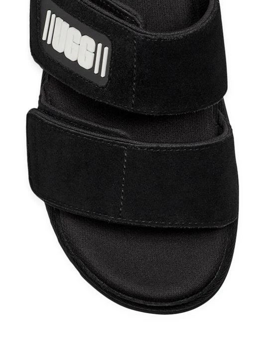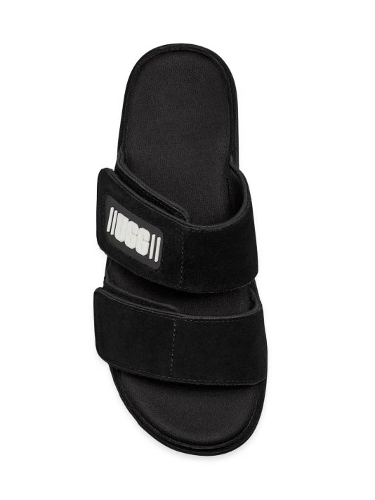 These leather slides feature dual straps with a rubberized logo patch.
