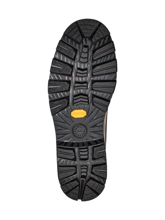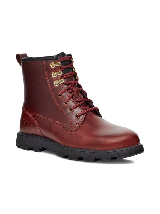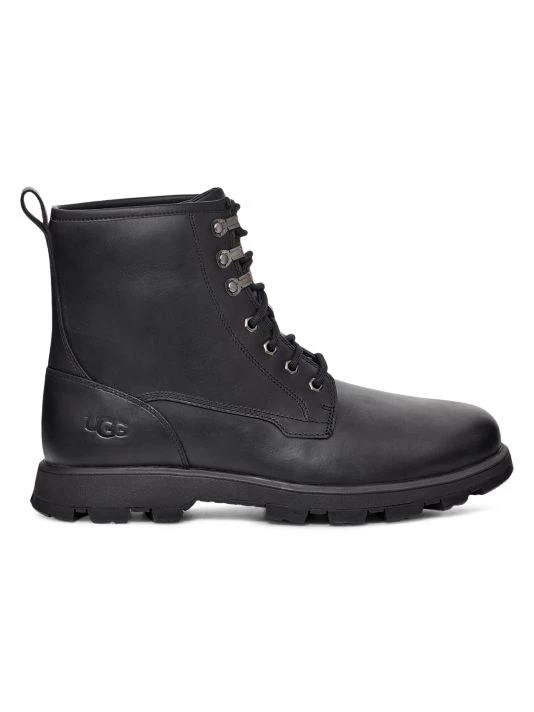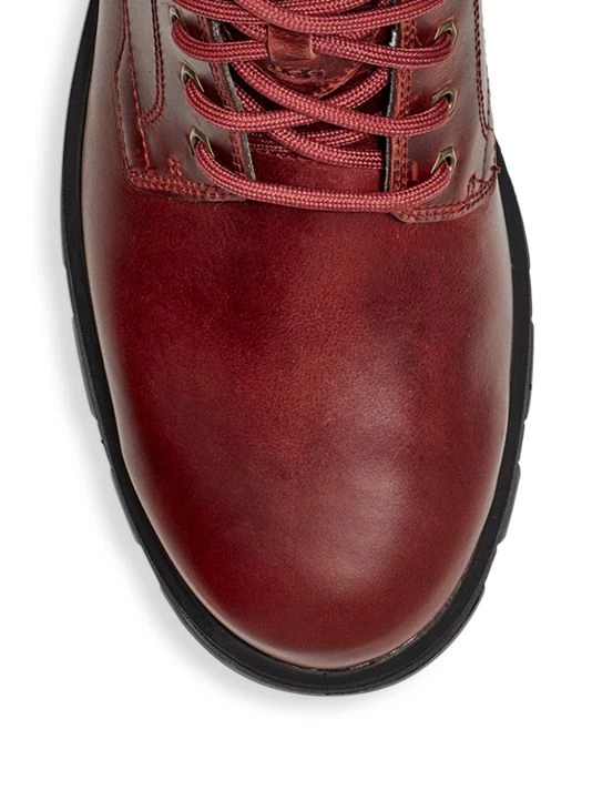 Leather lace-up boots featuring a heat-embossed logo and a molded rubber lug sole.