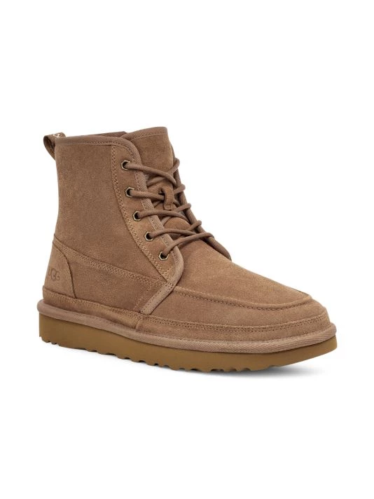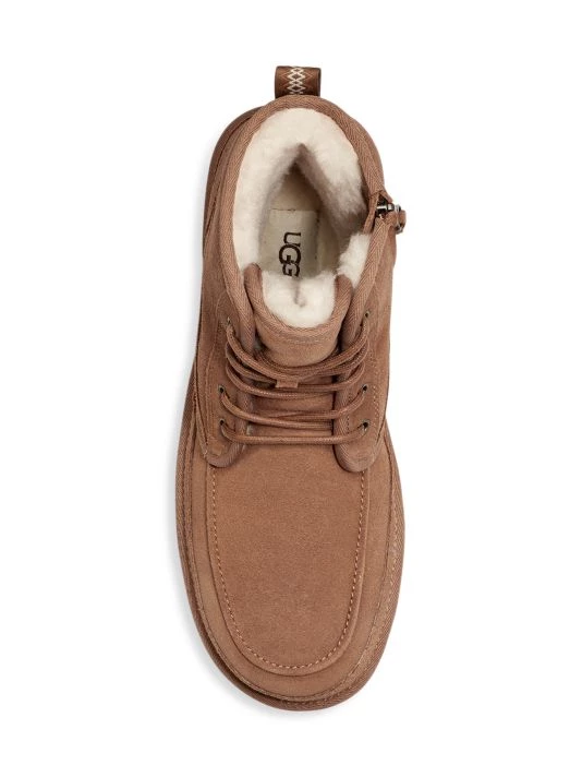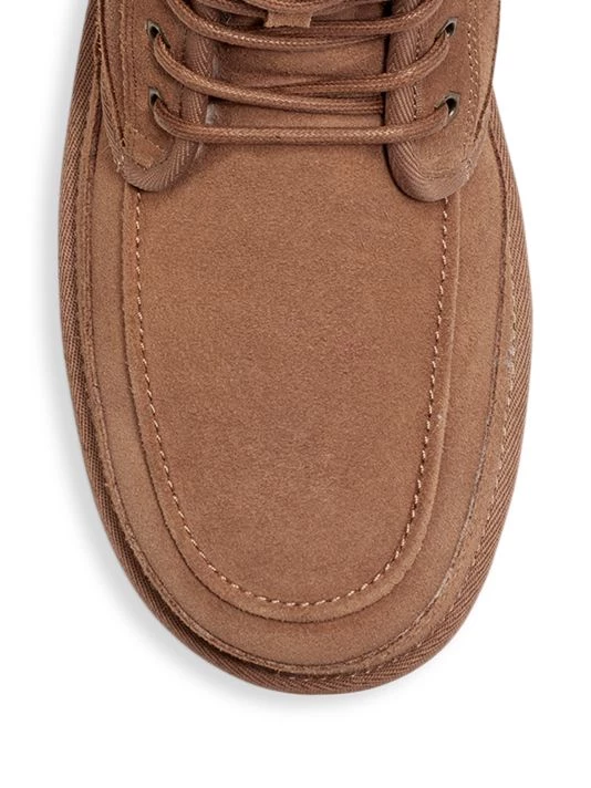 Suede laced boots with a side zipper and moccassin inspired toe design.